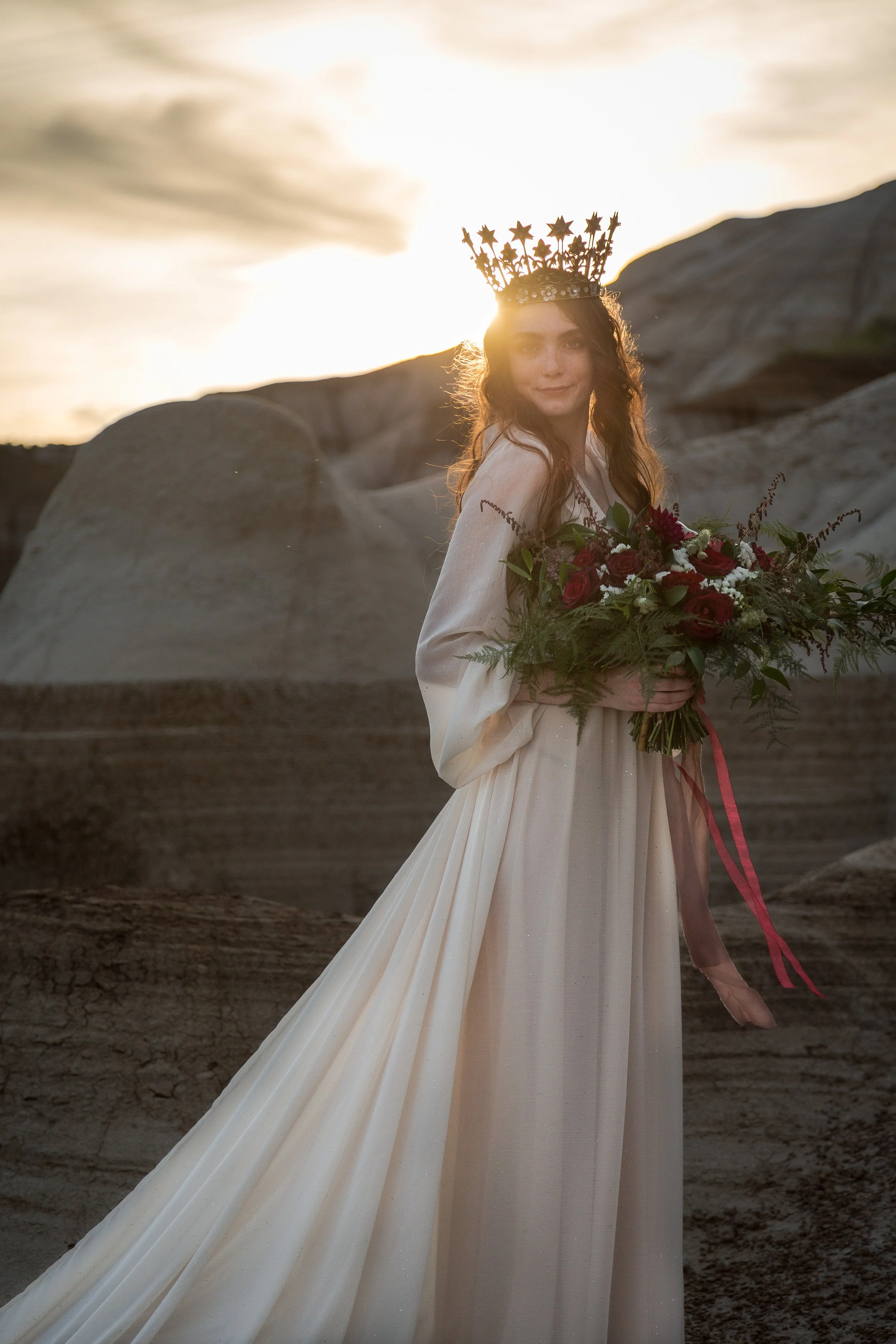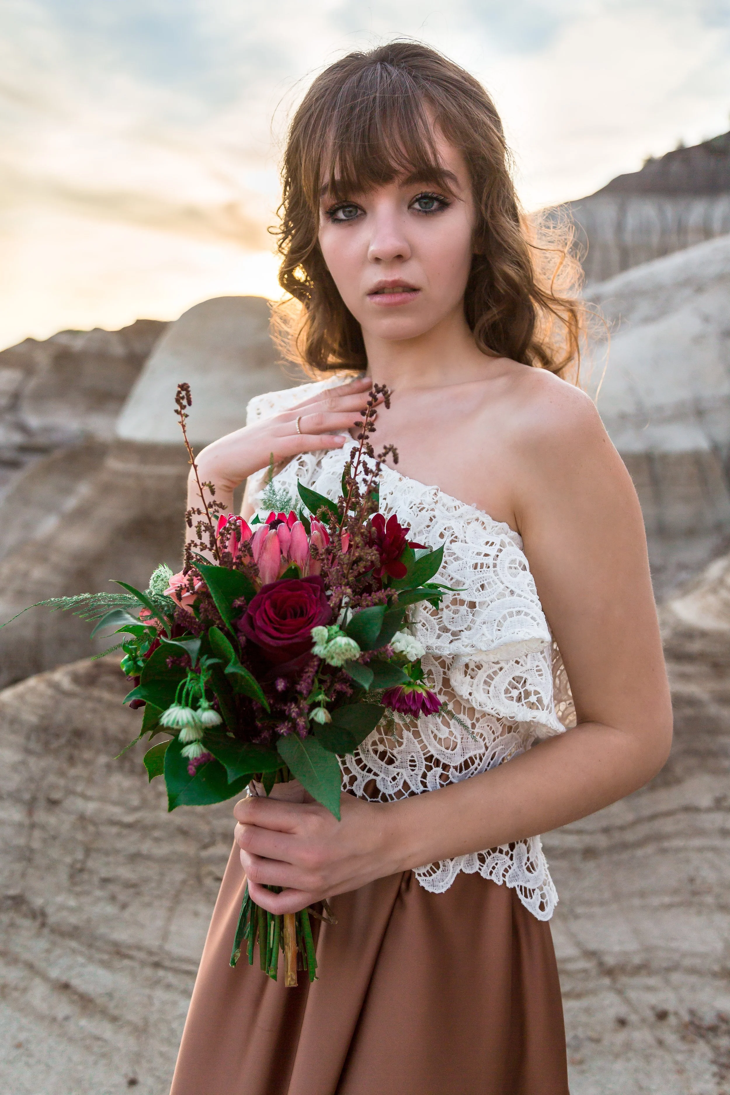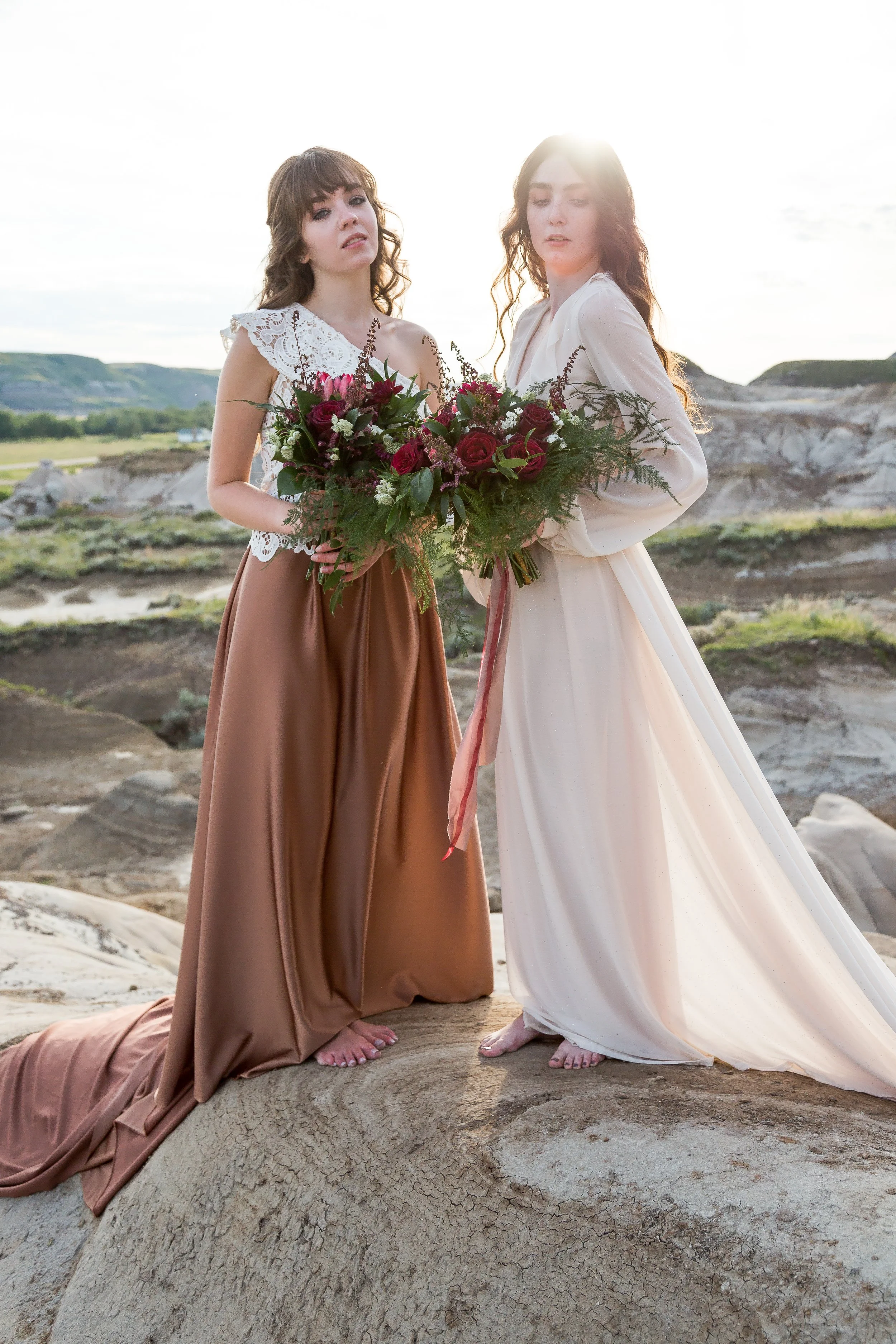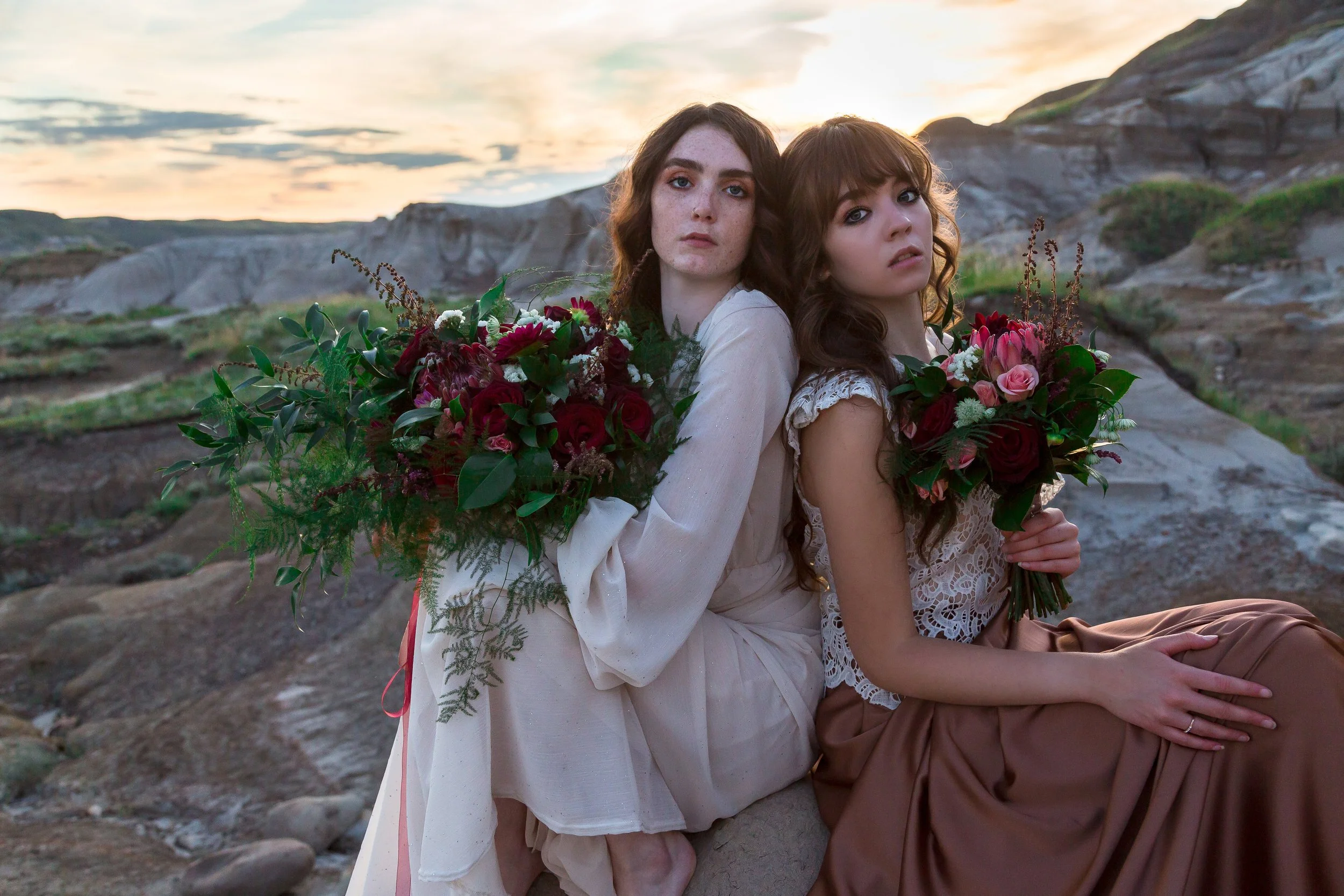 I was asked by the photographer for this shoot to create a moody rich tone floral color palette with the florals, a natural look to accent the badlands and stunning neutral tone gowns. Which would also complement the golden hour portraits.